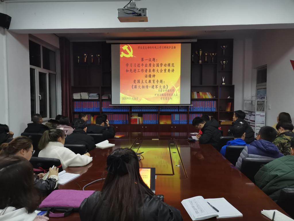 为大力弘扬劳模精神,激励和带动全体学生,BEAT365英国官网党总支于2020年11月26日晚上19:30,在临曦楼二楼党员之家线上线下同步开展专题理论学习活动。本次学习内容是:第一议题:学习习近平出席全国劳动模范和先进工作者表彰大会重要讲话精神;爱国主义教育专题:观看《薪火相传-建军大业》视频。