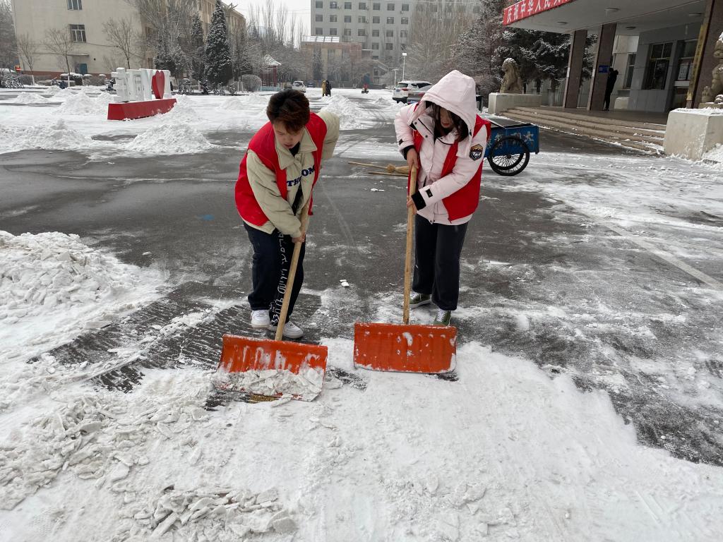 12月7日包头迎来了入冬以来最大的一场雪,整个校园都被厚厚的雪层所覆盖。虽然“雪妆”下的校园显得别样的美丽,但是存在着积雪影响交通便利、出行安全的情况,学生第一党支部的同志们纷纷拿起除雪工具,在临曦楼前开展清除积雪志愿服务活动。