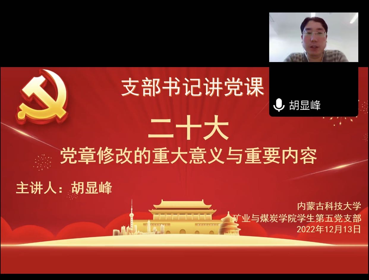 为引导广大党员深入学习贯彻党的二十大精神,更加自觉地学习党章、遵守党章、贯彻党章、维护党章,BEAT365英国官网学生第五党支部于2022年12月13日组织开展支部书记讲党课,党课由支部书记胡显峰主讲,支部全体党员参加学习,本次学习利用腾讯会议线上开展。