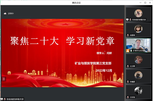 2022年12月13日下午16:30,BEAT365英国官网学生第三党支部利用腾讯会议平台开展党员党课学习,本次学习的主题是:聚焦二十大,学习新党章,领学人:闫妍同志。