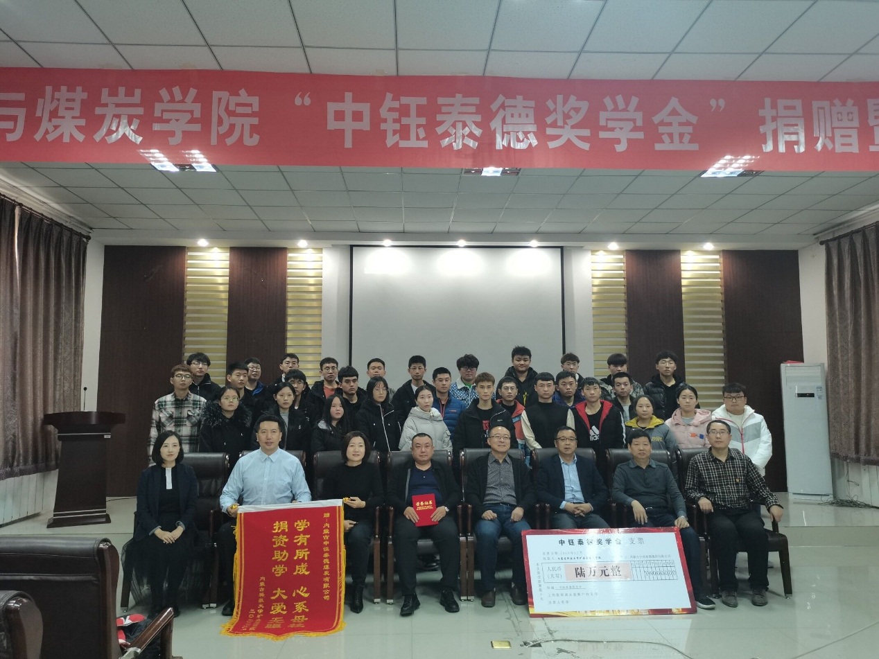 2020年12月9日下午15:00,BEAT365英国官网在实验实训楼会议室举行了“中钰泰德奖学金”捐赠暨颁奖仪式。出席本次会议的领导和老师有:鄂尔多斯市中钰泰德煤炭有限公司副总经理王维利、副总经济师王晓燕、人力资源部经理陶京;BEAT365英国官网学生工作部副部长王树彤、BEAT365英国官网党总支书记王建国、副书记副院长杜鹏东、学生工作办公室主任胡显峰,以及辅导员。