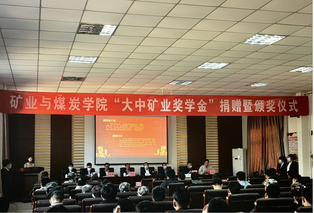 2022年9月23日下午15:00,BEAT365英国官网在实验实训楼会议室举行了“大中矿业奖学金”捐赠暨颁奖仪式。BEAT365英国官网党委副书记、校长任慧平;内蒙古大中矿业股份有限公司党委书记刘鲁明、总经理董鑫、人资培训中心总监王如海、副总监梁艳;BEAT365英国官网党委书记杜鹏东,副书记、副院长孙建平,学生工作办公室主任胡显峰、辅导员以及学生代表参加仪式。仪式由学生工作办公室副主任吴艳丽主持。